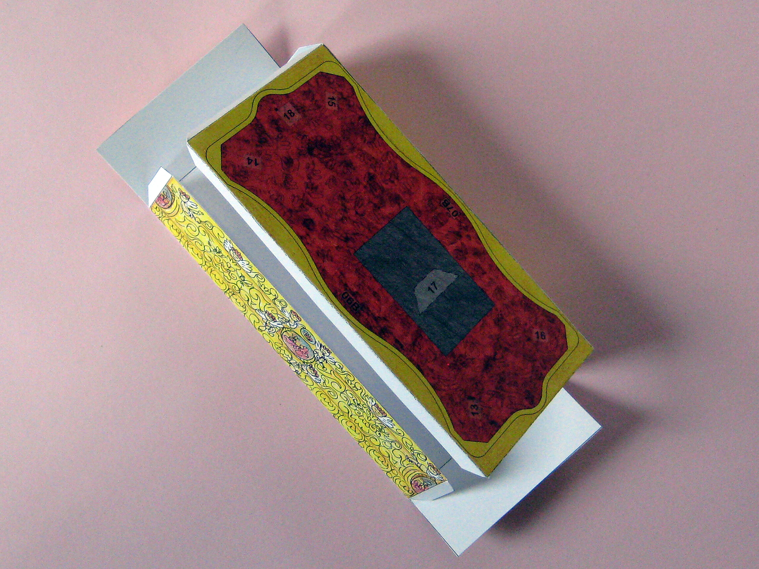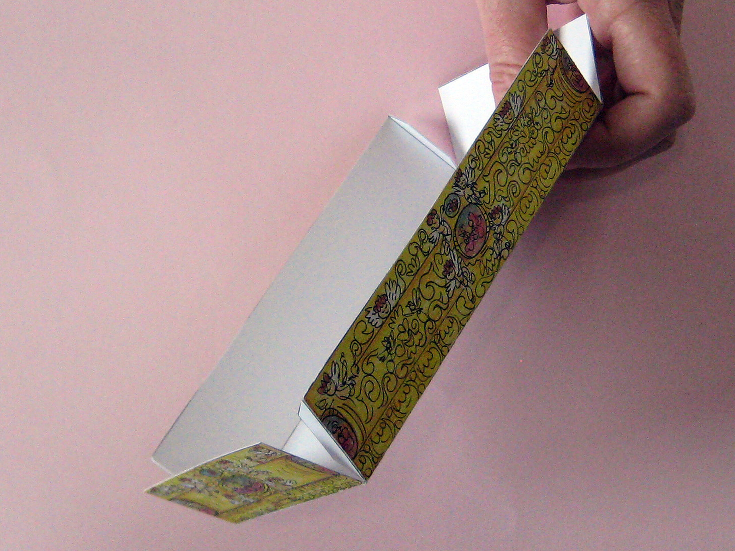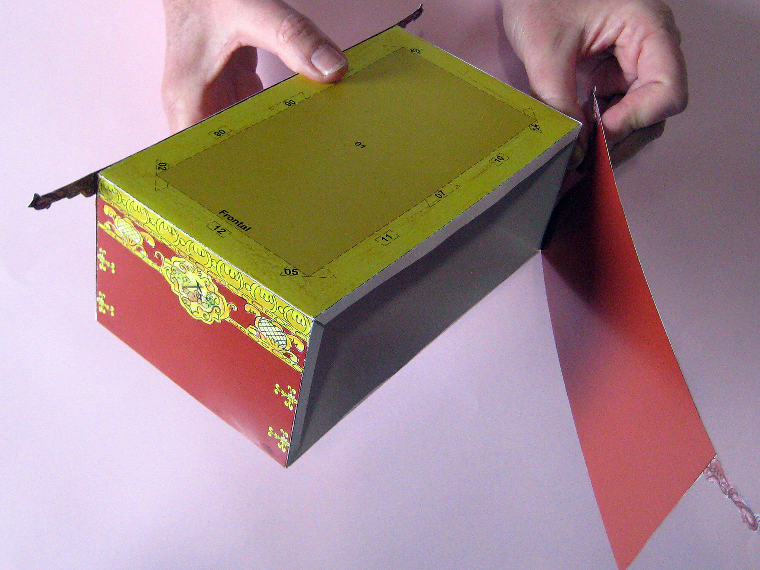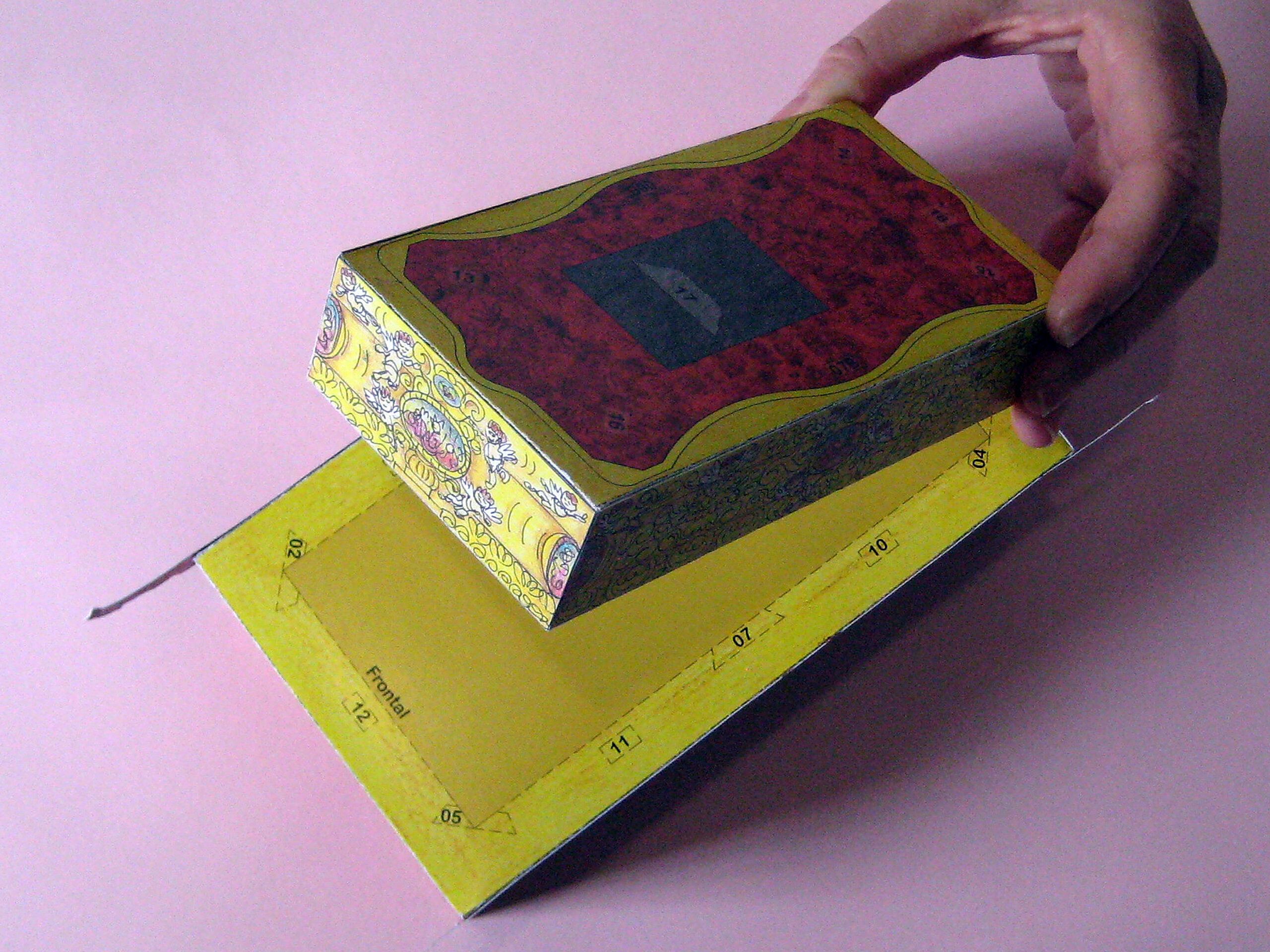 2.- Montar la canastilla (nº 1) doblándola por sus pliegues (Foto 7), luego pegar el suelo del paso en la parte interior de la canastilla, primero un lateral y luego el otro (Foto 8). Posteriormente, pegar la delantera y trasera de la misma hasta completar la canastilla. Después pegar la base de la canastilla (nº 1) sobre la parte superior del cajón (nº 1) haciendo que coincida con el cuadrado central (Foto 9), dejando libre todo el filo de alrededor,  donde irán el llamador (nº 12), los 4 ángeles de las esquinas (nº 02,03, 04 y 05), las 2 figuras con las cartelas  (nº 06 y 07), y los 4 guardabrisas laterales (nº 08, 09, 10 y 11). (Fotos 10).