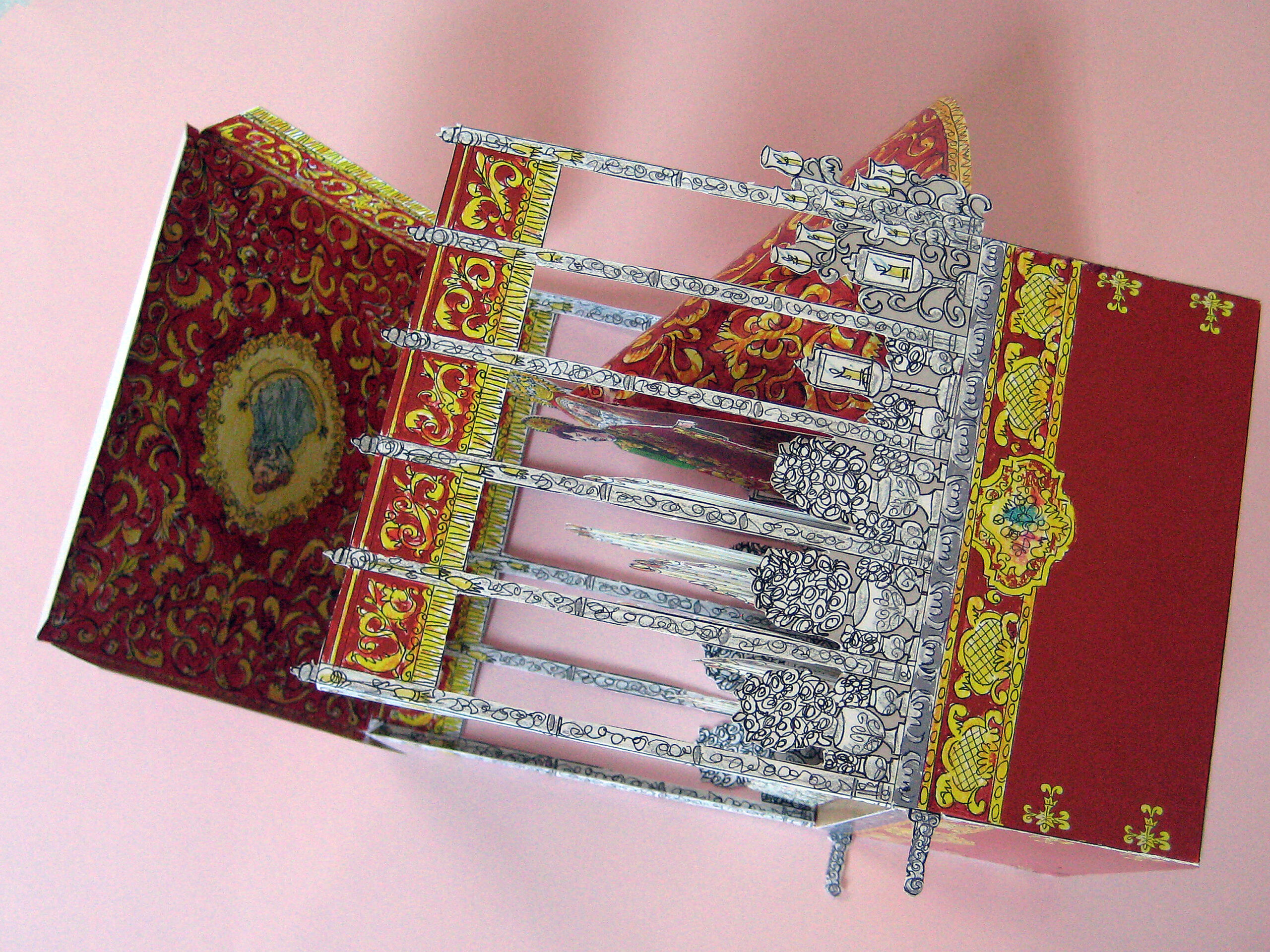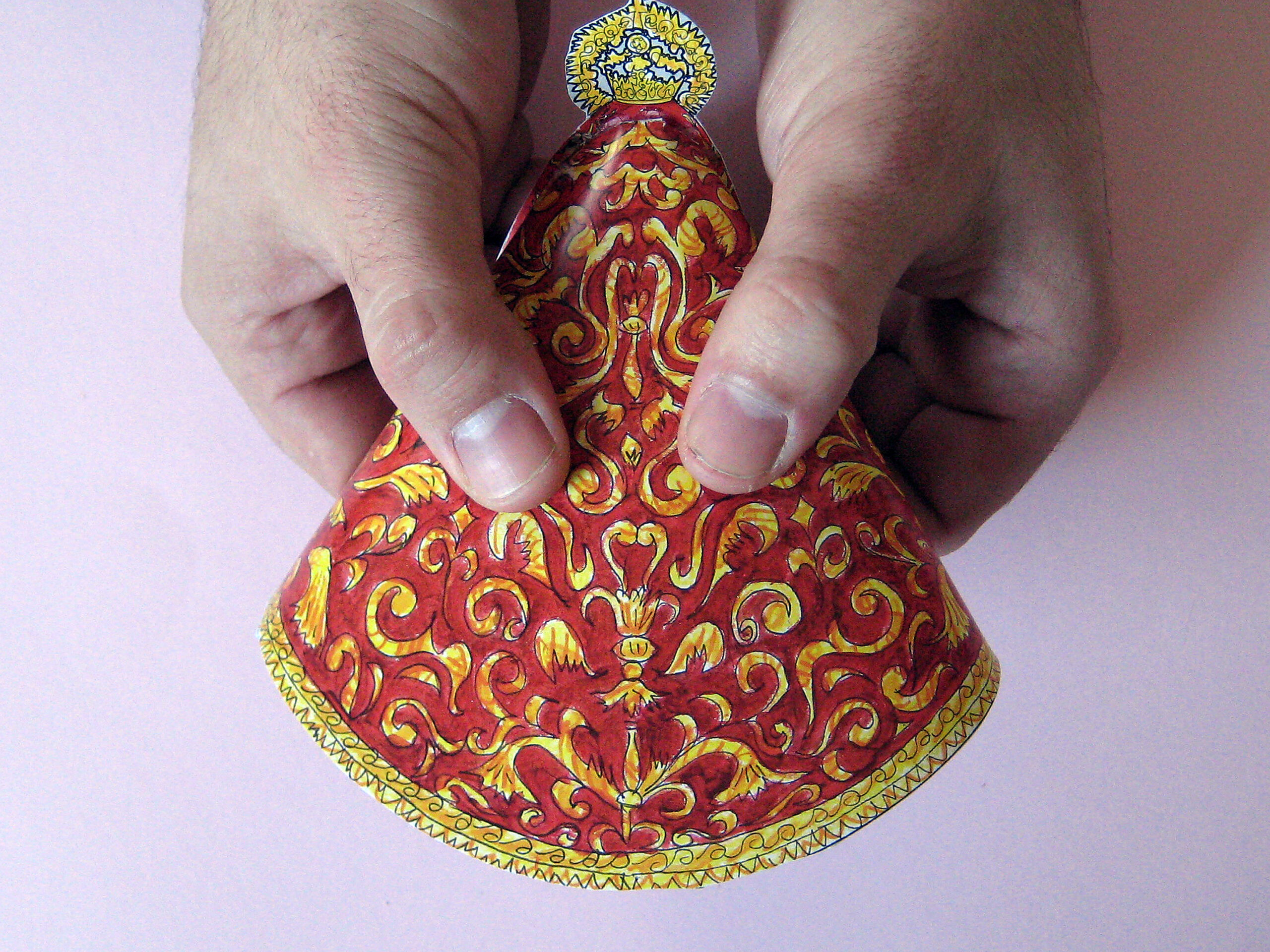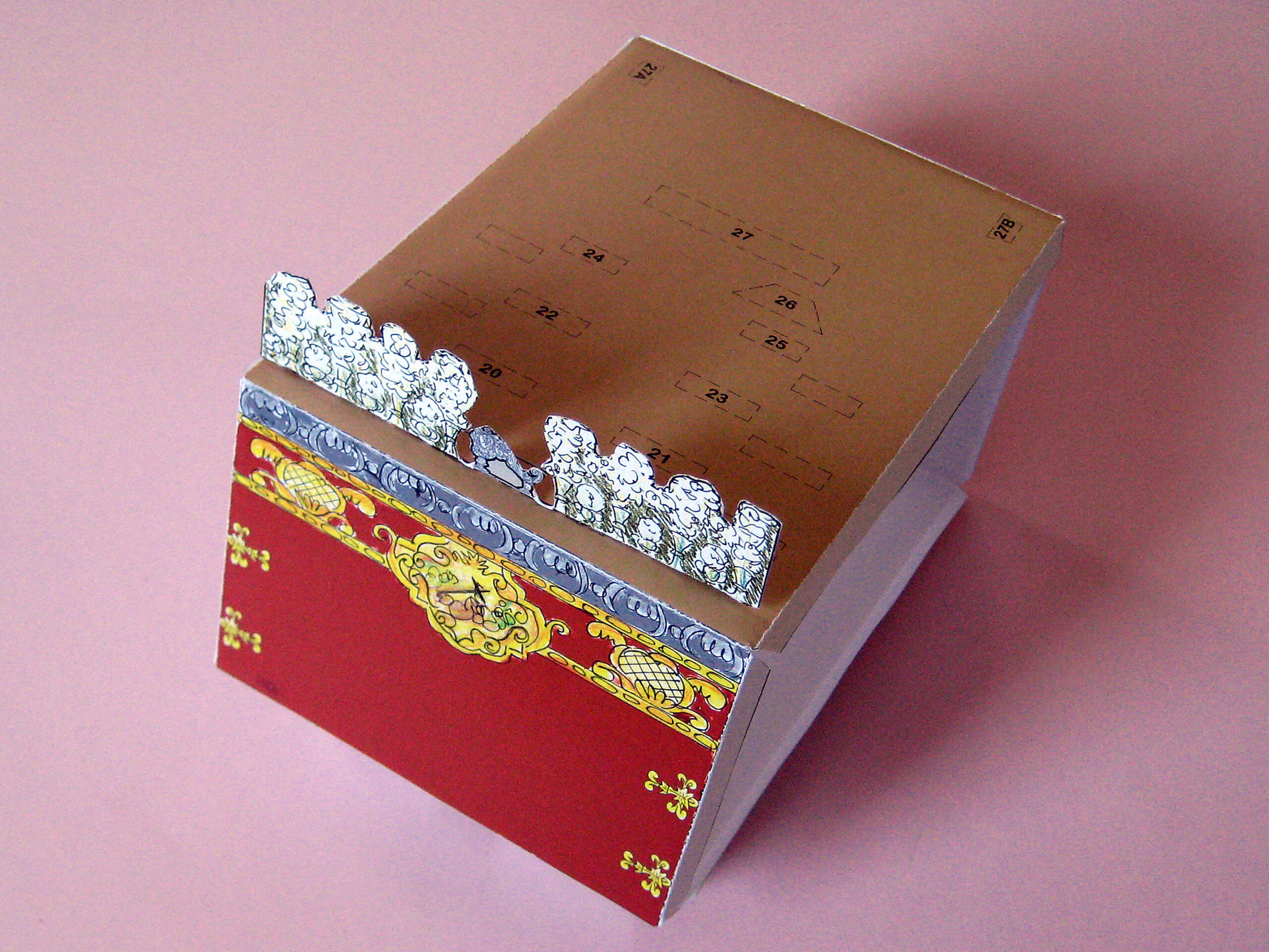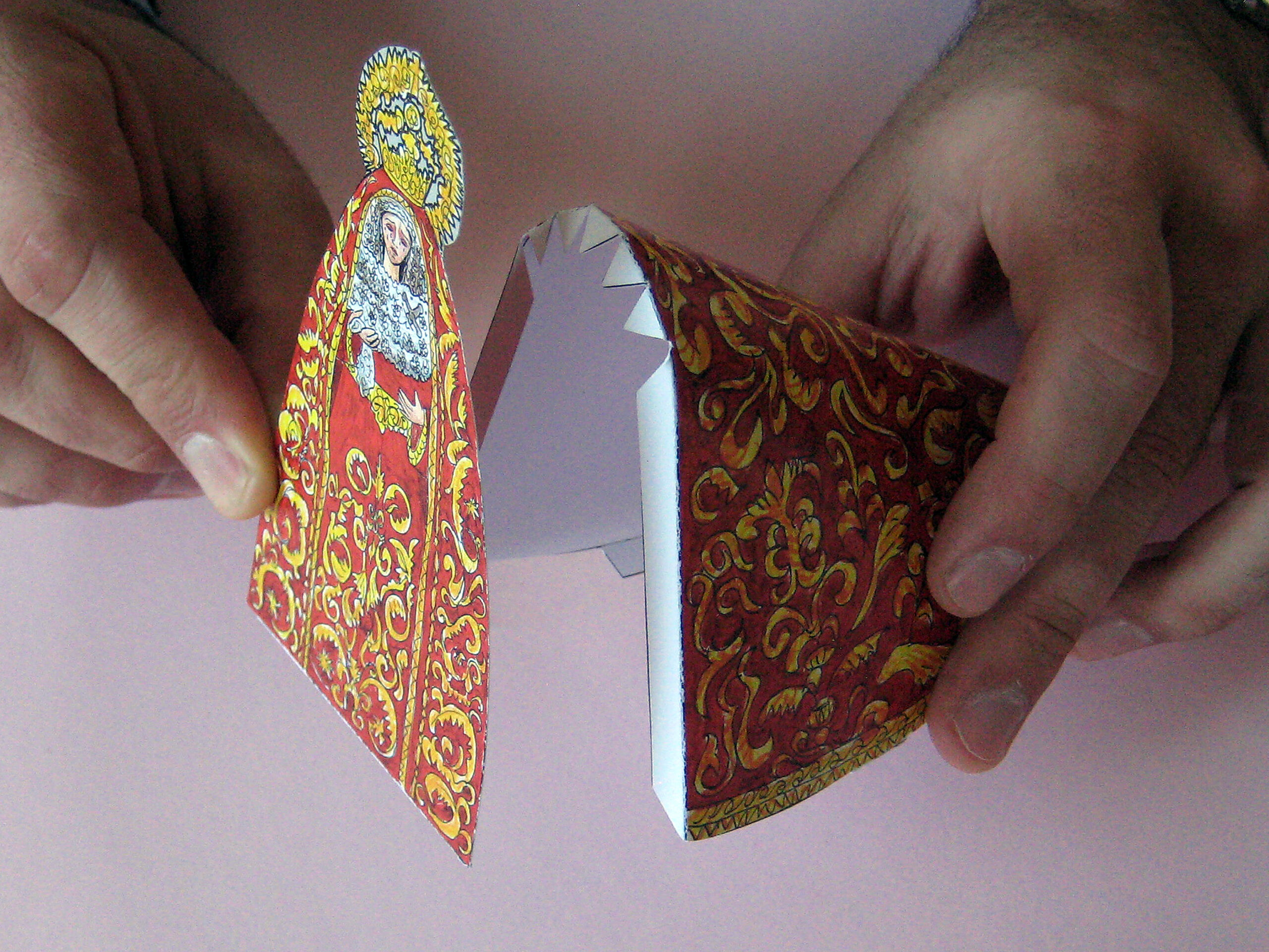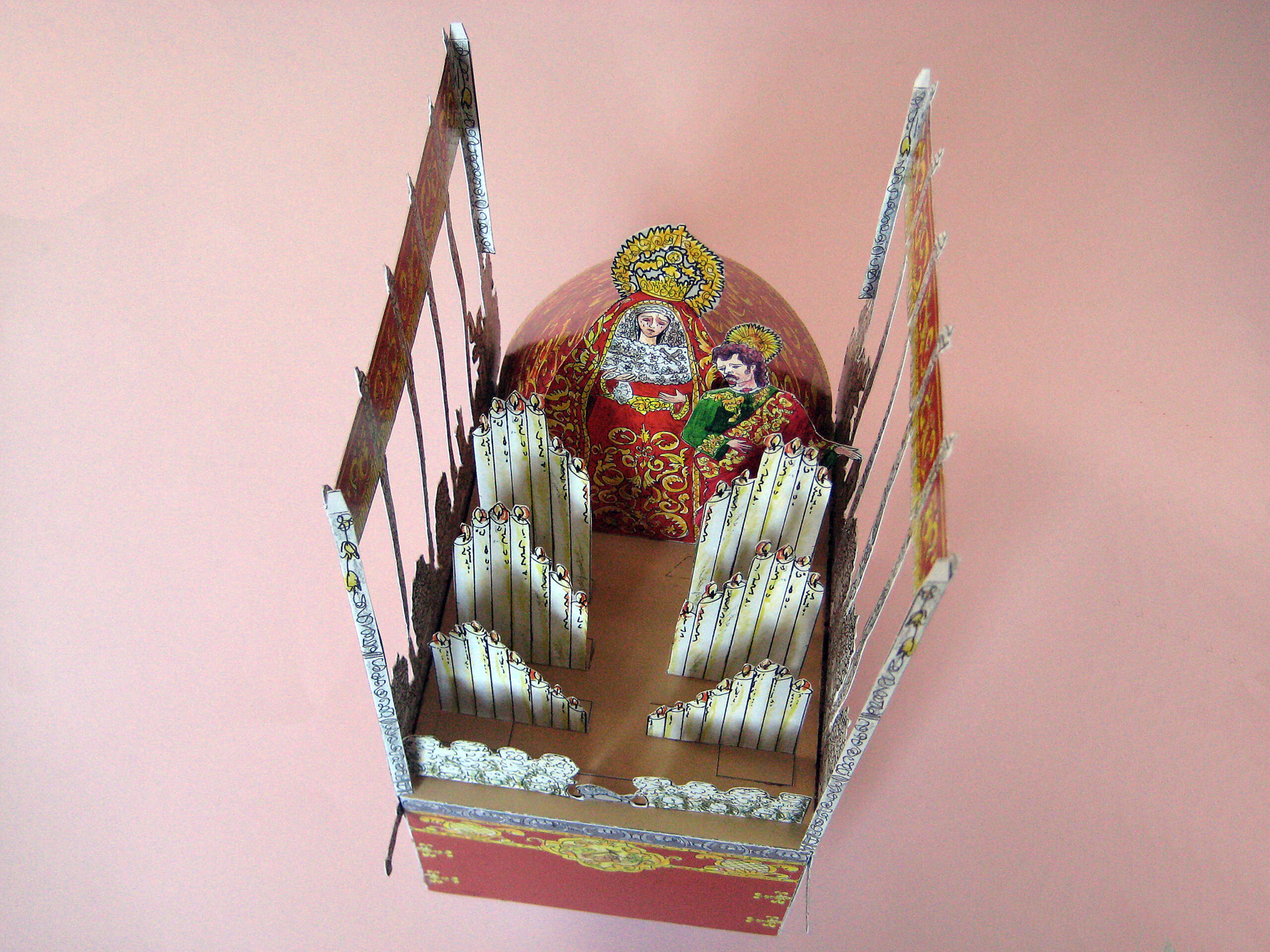 3.- Pegar el manto sobre la espalda de la Virgen. (Foto 17). Después forzar un poco la cartulina para que el manto quede curvado (Foto 18), y pegar la Virgen con las tres pestañas (nº 27, 27ª y 27B) en su posición sobre la mesa del palio (Foto 19) y, luego, pegar el San Juan en el número indicado (nº 26).