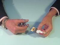 Con el pegamento de contacto incoloro se pegará en menos tiempo y con más solidez. Para que el pegado sea más rápido, una vez untado el pegamento, soplar sobre el mismo antes de acoplarlo hasta que cambie su aspecto cristalino por opaco, así se solidificará más pronto. Aparte, será conveniente emplear una tijera pequeña de puntas para recortar las partes más estrechas.