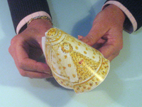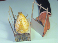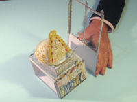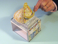 5.- Montar el techo del palio. Recordando que es fundamental haberle hecho antes los hendidos por las líneas indicadas en el interior del techo, y haber doblado las líneas laterales exteriores donde se pegarán a la parte superior de los varales. (Foto 23). Posteriormente, pegar las 4 pestañas del techo para curvarlo por su parte interior, y unir los laterales con la pestañas de las 4 esquinas (Foto 24, 25). Luego pegar el remate del techo (nº 5) en el círculo central del mismo, colocando cada pestaña en su sitio, una adelante y la otra hacia atrás. (Foto 26).