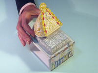 3.- Pegar el manto a la espalda de la Virgen (forzar un poco la cartulina curvándola para que sea más cómodo) (Foto 14) y, una vez adherido, doblar y pegar la pestaña inferior de la Virgen (nº 3) sobre la parte superior de la peana (nº 3). (Foto 17). A continuación pegar la media luna (nº 4) delante de la Virgen (nº 4). (Foto 18).