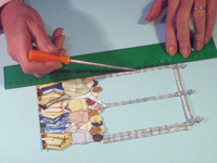 Todas las figuras (flamencas, cohetero, romeros, etc…) llevan en la base una línea que hay que doblar y cortar al centro, teniendo en cuenta que esos dobleces deben ir cada uno para un lado distinto (uno para delante y otro para atrás). Luego recortar las bases que vienen aparte (rectángulos de albero) y pegar las figuras sobre ellas. De esa manera quedarán más estables y serán más fáciles de mover. (Fotos 2, 3 y 4).
