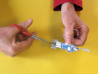 Con el pegamento de contacto incoloro, se pegará en menos tiempo y con más solidez. Para que el pegado sea más rápido, una vez untado el pegamento, soplar sobre el mismo antes de acoplarlo hasta que cambie su aspecto cristalino por opaco, así se solidificará más pronto.