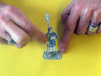 Todas las figuras (nazarenos, acólitos, capataces, etc…) llevan en la base una línea que hay que doblar y cortar al centro (Foto 3), teniendo en cuenta que esos dobleces deben ir cada uno para un lado distinto (uno para delante y otro para atrás). Luego recortar las bases que vienen aparte (óvalos de adoquines) y pegar las figuras sobre ellas (Foto 4). De esa manera quedarán más estables y serán más fáciles de mover.PASO DE CRISTO: