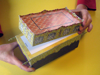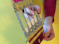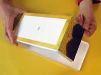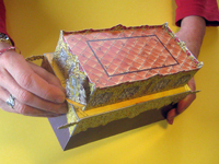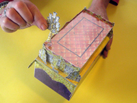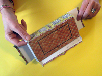 2.- Montar la canastilla doblándola por sus pliegues, luego pegar el mosaico (suelo del paso) primero, un lateral y luego el otro. (Fotos 10 y 11). Posteriormente, pegar la delantera y trasera de la misma hasta completar la canastilla (Fotos 12). Luego pegar la base de la canastilla (nº 22) sobre la parte superior del cajón (nº 22) haciendo que coincida con el cuadrado blanco de la mesa (Foto 13), dejando libre todo el filo de alrededor (parte dorada), que es donde irán los 4 ángeles de las esquinas y el llamador.