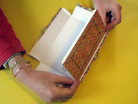 1.- Montar el cajón doblando y uniendo la pieza que lleva el faldón delantero con la mesa, con la otra pieza que lleva el faldón trasero, y así obtendremos el cajón que quedará con los laterales libres (Foto 6) y, posteriormente, pegar los dos laterales.(Foto 7)