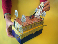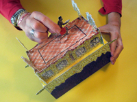 4.- Doblar en ángulo los dos varales delanteros, habiéndole hecho los hendidos por la línea central, así reforzará el techo y se verán frontal y lateralmente (Foto 28). Luego pegar por el lado adecuado los dos laterales a la mesa, que llevan incluidos los varales, las jarras y las bambalinas (Fotos 29 y 30), teniendo en cuenta que los candelabros de cola van en la parte trasera.