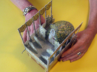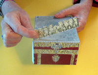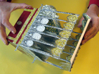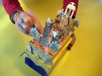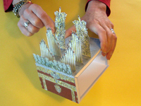 5.- A continuación, pegar el techo de palio con la Gloria hacia el interior. (Foto 31) Para ello, será más fácil tumbando el paso lateralmente, haciéndolo coincidir con los varales interiores (Foto 32) y, por fuera, con la línea exterior que hay al final de los varales. Finalmente, pegaremos en la parte delantera y trasera del techo, las dos coronas que rematan la crestería.