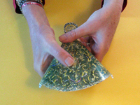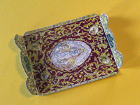 3.- Pegar el manto sobre la espalda de la Virgen. (Foto 25) Después forzar un poco la cartulina para que el manto quede curvado (Foto 26), y pegar la Virgen con las tres pestañas (nº 30, 30-A y 30-B) en su posición sobre la mesa del palio (Foto 27)