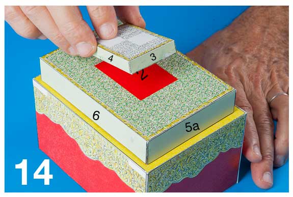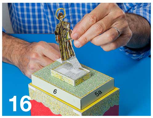 3.- Posteriormente montar la caja de la peana (foto 12) y pegar la base de la misma (nº 2) (foto 13 y 14) sobre la parte superior de la canastilla (nº2), haciendo que coincida con el cuadrado indicado. Después, pegar los 4 embellecedores (foto 15)(nº 3 y 4) en los 4 lados de la peana (nº 3 y 4). Finalmente, pegar la figura de San Juan Bosco con sus dos pestañas sobre los huecos indicados en la peana. (foto 16)