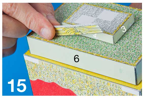 6.- Por último, pegar los 4 candelabros con figura (nº 12, 13, 14 y 15) en las 4 esquinas de la mesa, procurando que las pestañas no sobresalgan de la línea del paso. (foto 18)
