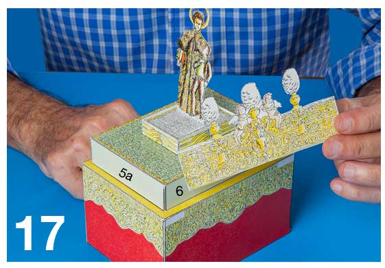 4.- Pegar los 4 embellecedores (nº 5a, 5b y 6) (foto 17)en los 4 lados de la canastilla (nº 5a, 5b y 6), teniendo en cuenta que en la parte delantera van dos ángeles con figura y reliquia y, en la parte trasera, dos ángeles con jarra de flores. (foto 18)