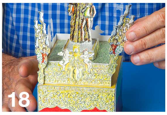 5.- Pegar la 4 jarras (nº 18, 19, 20 y 21), en los laterales de la peana. (foto 27)