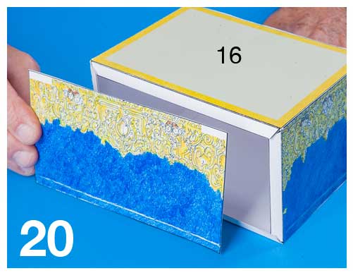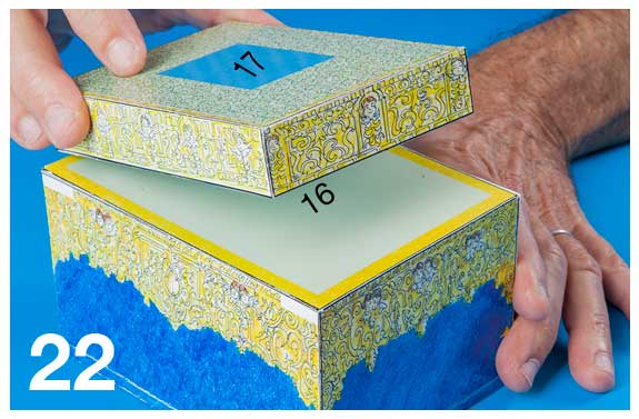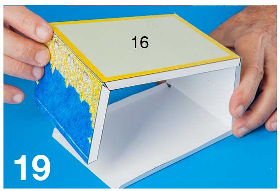 2.- Montar la canastilla (foto 21) y, una vez montada, pegar la base de la misma (nº 16) sobre la parte superior del cajón (nº 16), haciéndolo coincidir con el cuadrado de la mesa. (foto 22)
