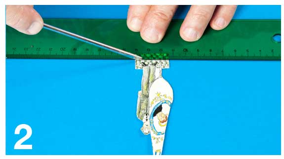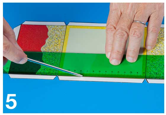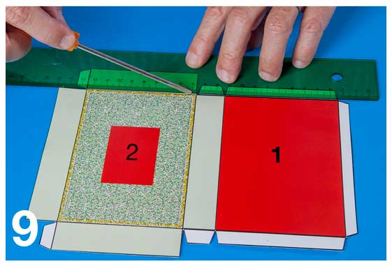 Es primordial y fundamental que, en todas la líneas que haya que doblar, se utilice una regla para apoyarse sobre ellas marcándolas y pasándoles la punta un destornillador o de una tijera para hacerle un hendido a la cartulina por la raya marcada. Así se doblarán con más facilidad y los dobleces estarán rectos. (foto 1)