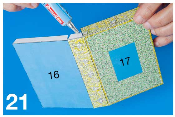 7.- Pegar los 4 candelabros de las esquinas (nº 24, 25, 26 y 27) en sus correspondientes números, teniendo en cuenta que una de las pestañas -la más corta- va hacia delante. (foto 28)