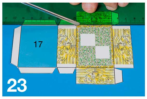 3.- Montar la peana (foto 23 y 24) y pegar la base de la misma (nº 17) sobre la parte superior de la canastilla (nº 17), haciéndola coincidir con el cuadrado marcado en la canastilla. (foto 25)