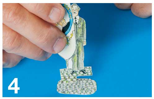 Todas las figuras (acólitos, capataces, etc…) llevan en la base una línea que hay que doblar y cortar al centro, teniendo en cuenta que esos dobleces deben ir cada uno para un lado distinto (uno para delante y otro para atrás) (foto 2 y 3). Luego recortar las bases que vienen aparte (óvalos de adoquines) y pegar las figuras sobre ellas. De esa manera quedarán más estables y serán más fáciles de mover. (foto 4)
