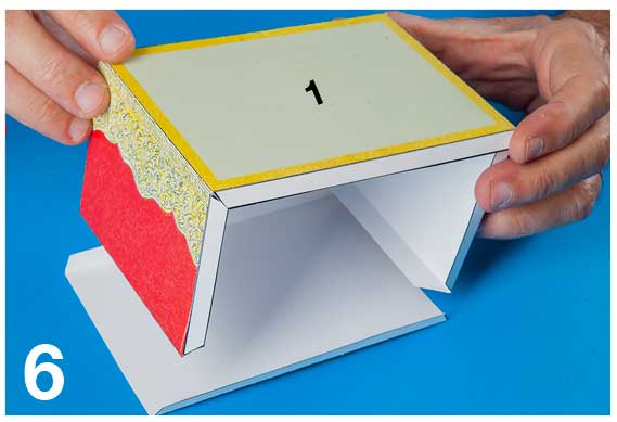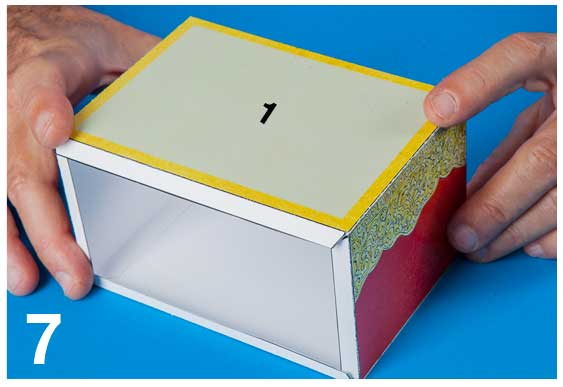 1.- Montar el cajón doblando la delantera y trasera del mismo (foto 5), para luego pegarle la base hasta formar la mesa completa, que quedará con los laterales libres (foto 6). Posteriormente, pegar los dos laterales. (foto 8)